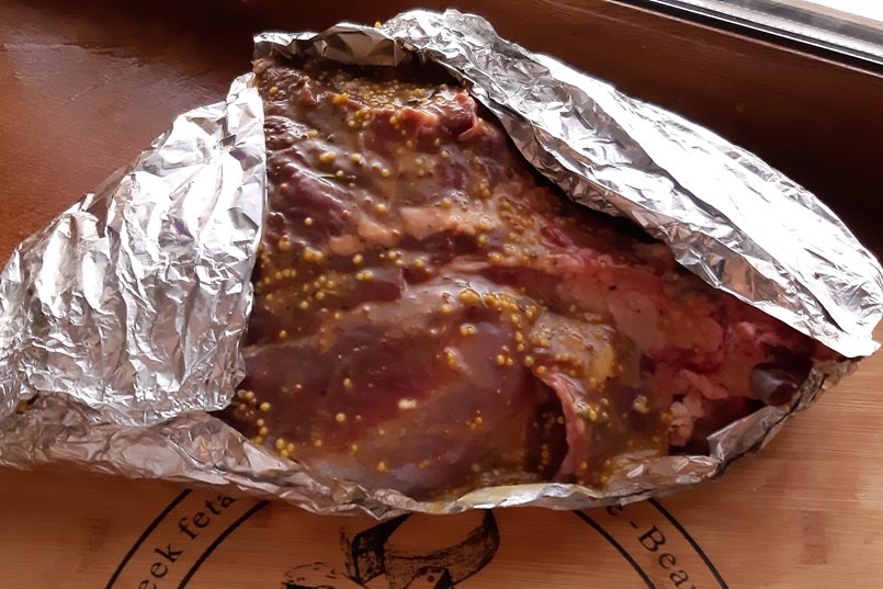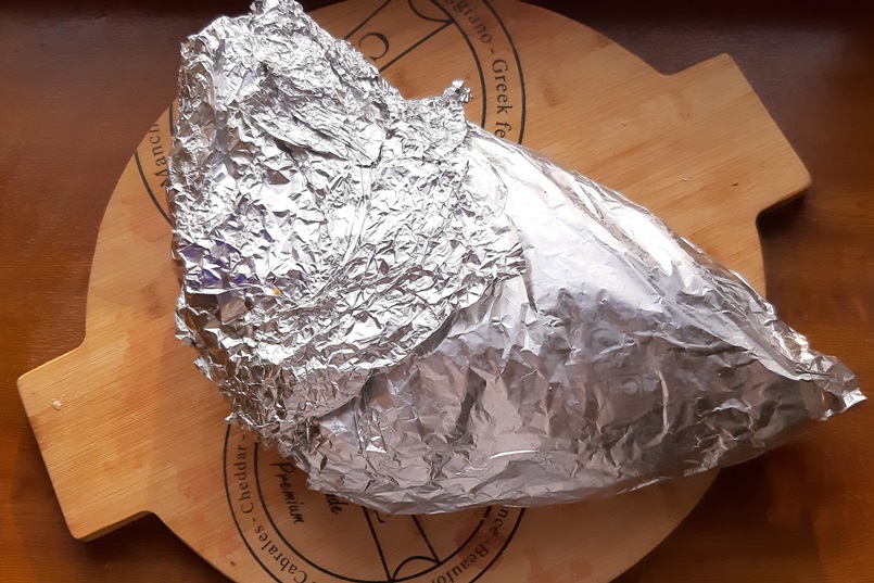 Берем 2 метра фольги. Сворачиваем в два слоя, обертываем баранину с одной стороны. Затем — такой же отрез, и снова — вдвое и заворачиваем с другой стороны. Скрепляем усердно по швам, чтобы не вытекал сок. Убираем в холодильник на 12-24 часа. Стараемся не вспоминать о ней все это время.