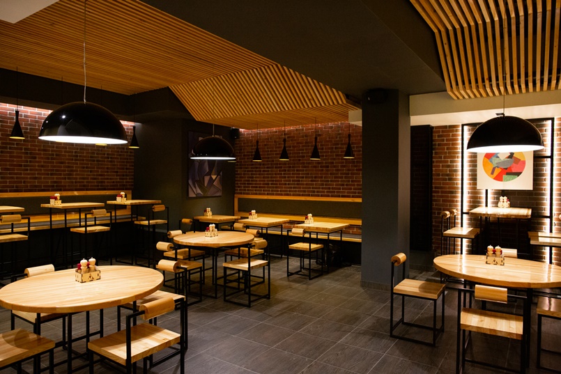 В мягком полумраке светлыми островками выделяются высокие столы и стулья оригинальной формы. За освещение отвечают в основном подвесные лампы, в каждой зоне разные. В дальней части зала — модные сейчас изящные конусы, в центре — большие плафоны, похожие на перевернутые чаши. А у самой яркой, желтой стены комнаты — световые панели с прикрепленными к ним натюрмортами и портретами в виде набросков и абстракций.