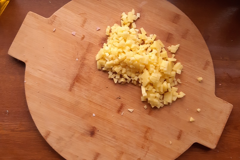 Пока варится бульон, подготовим остальное. Для впечатляющей солянки предлагаю резать ингредиенты мелкими кубиками в полсантиметра. Потратив чуть больше времени, вы получите стопроцентную эстетику и гармонию вкуса. Первым в ход пускаем бекон. Нарезаем, обжариваем, перекладываем в отдельную посуду.