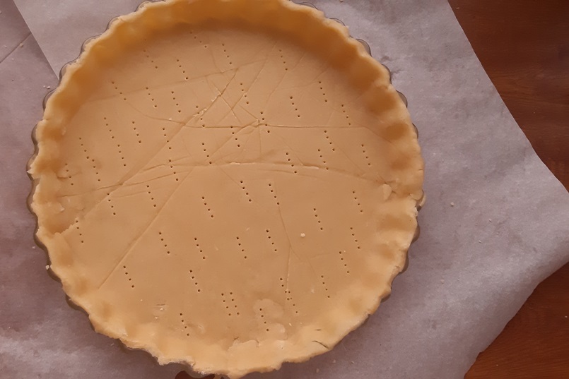 Достаем тесто, раскатываем между двух отрезов пергаментной бумаги. Можно взять и силиконовые коврики. Перекладываем в смазанную форму, обрезаем ножом по краю, прокалываем вилкой в нескольких местах.