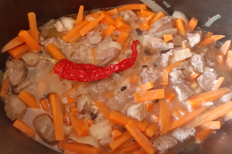 Кладем морковь, специи, перец (целиком), соль, добавляем чуть воды. Делаем огонь средним. Готовим 20 минут. Получился зирвак (узбекская подлива).