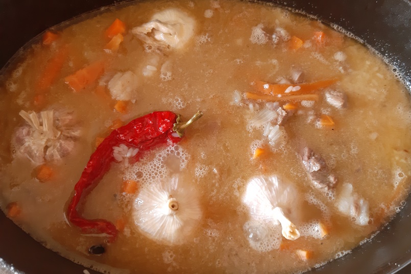 Добавляем промытый рис и головки чеснока. «Утопим» все в воде. По уровню она должна быть на сантиметр-полтора выше риса. Тушим в открытом виде до полного впитывания. Чтобы рис стал золотистого цвета — добавьте куркумы. Огонь — средний. Вы же знаете, что перемешивать – страшный грех?