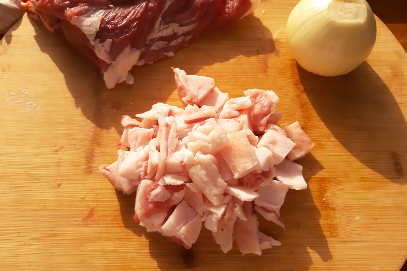 Мясо нарезаем кусками в 4 сантиметра. Полосками – курдючное сало. Берем чугунный казан. Нет казана – берем утятницу. Сковороду, кастрюлю не берем.