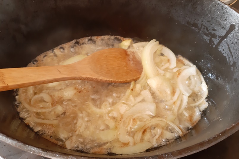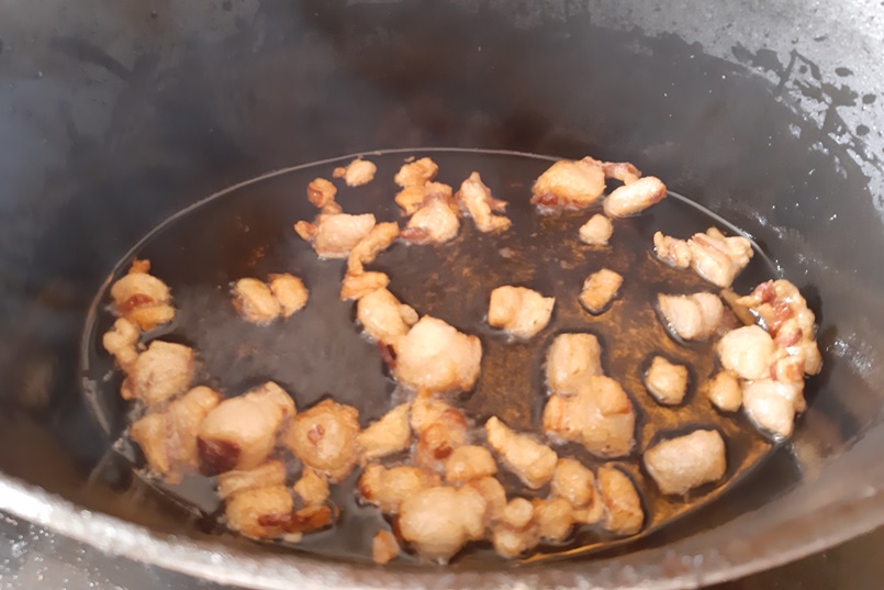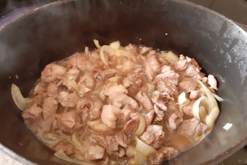 Нагреваем растительное масло, добавляем сало, вытапливаем, убираем шкварки. Добавляем лук, следом – мясо, обжариваем.