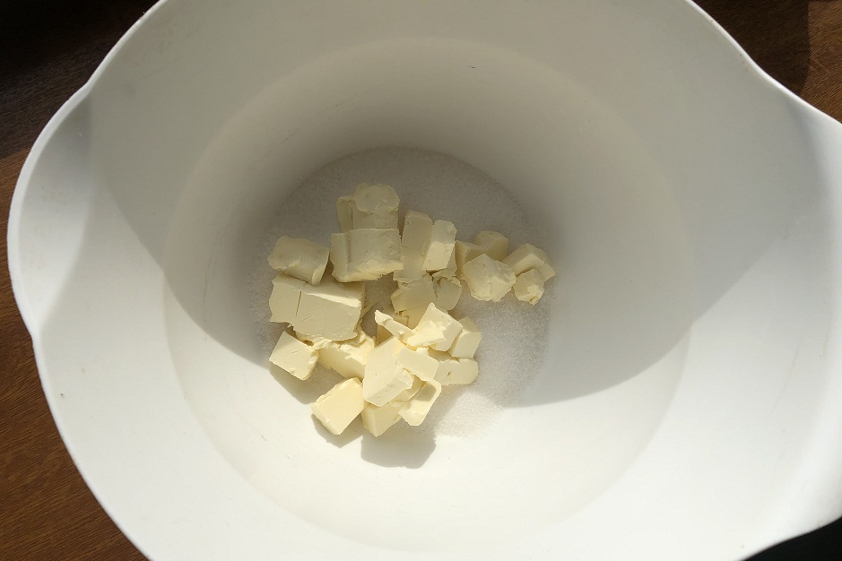 Для теста просеем муку. Яйца должны быть комнатной температуры, а сливочное масло – размягченным. Порежем его кубиками и смешаем с сахаром, получится тесто-крошка. Затем добавим в указанной последовательности желтки, белки, теплые сливки, муку. Достанем опару и хорошо перемешаем с тестом. Снова под смоченное горячей водой полотенце и в тепло на пару часов.