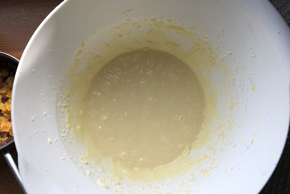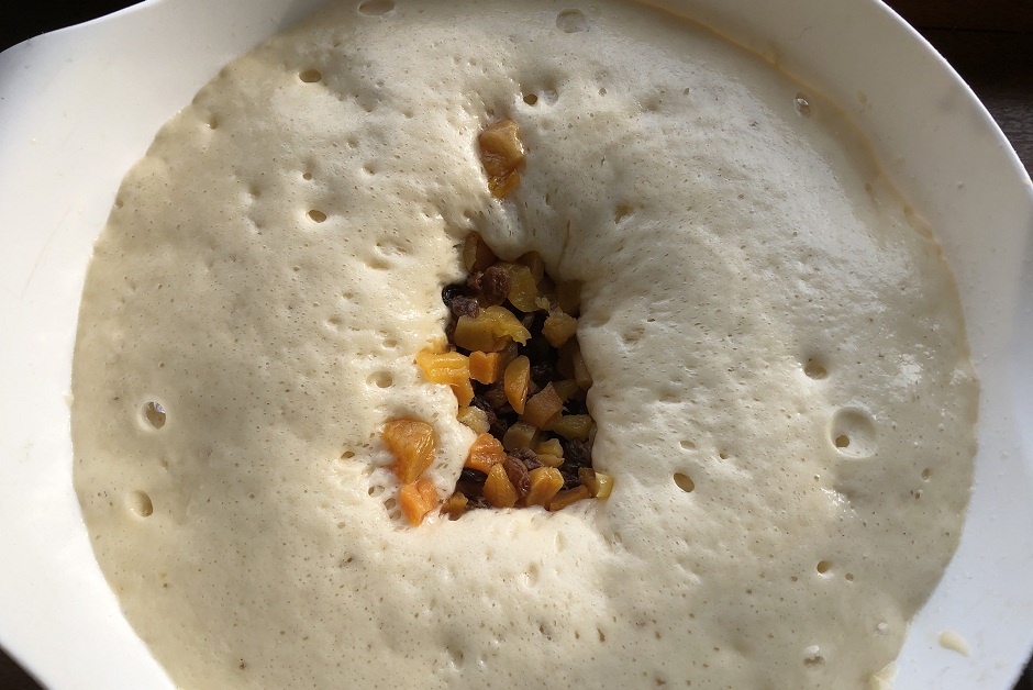 Первым делом — начинка. У меня изюм и порезанная курага. Помыла и замочила в роме. Можно взять ликер, крепленое вино или ароматный чай Earl Grey. Добавляйте в тесто сушеную вишню, цукаты, орехи, мак, цедру лимона и апельсина. Это единственный момент самодеятельности, пользуйтесь.