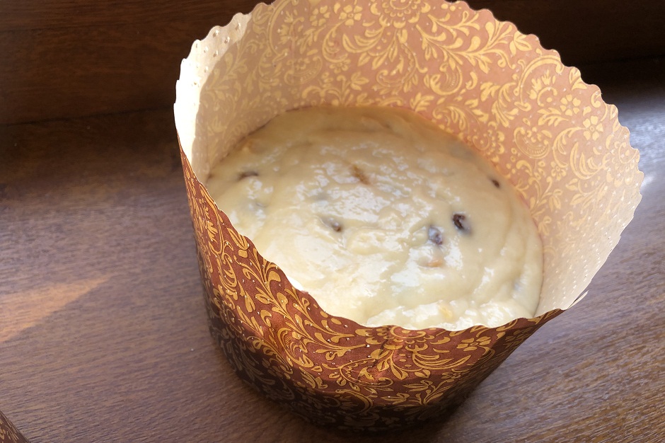 Сольем жидкость с изюма, избавимся от лишней влаги. Достанем тесто, добавим в него любимые специи и начинку. Перемешаем. Разложим по формам – чуть больше 1/3. У меня из указанного объема продуктов получились 2 больших кулича. Накроем пленкой, в тепло на 40 минут.