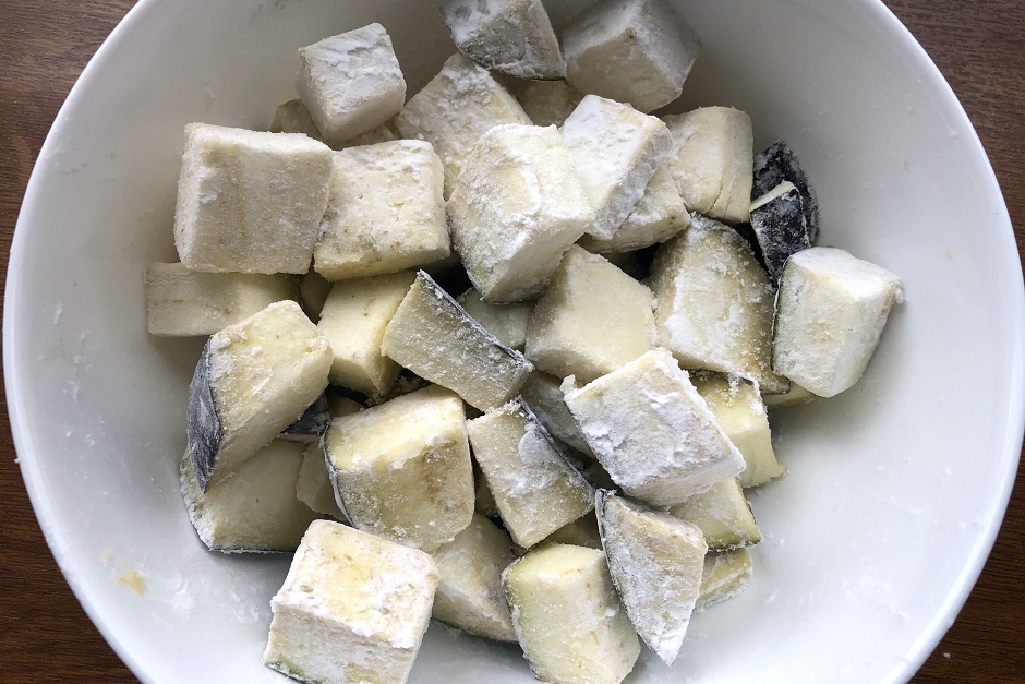 Нарежем баклажан кубиками в сантиметр-полтора. Дождемся, когда даст сок, избавимся от него бумажным полотенцем. Припудрим щедро крахмалом, перемешаем. Нарежем мясо тонкими полосками. Чем тоньше, тем лучше – быстрее промаринуется и так же приготовится.