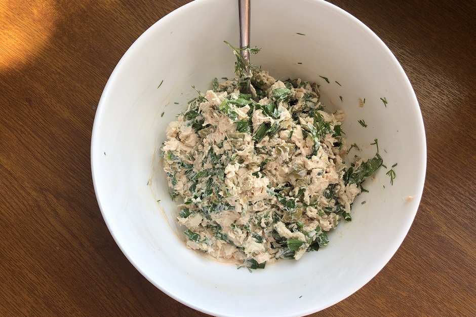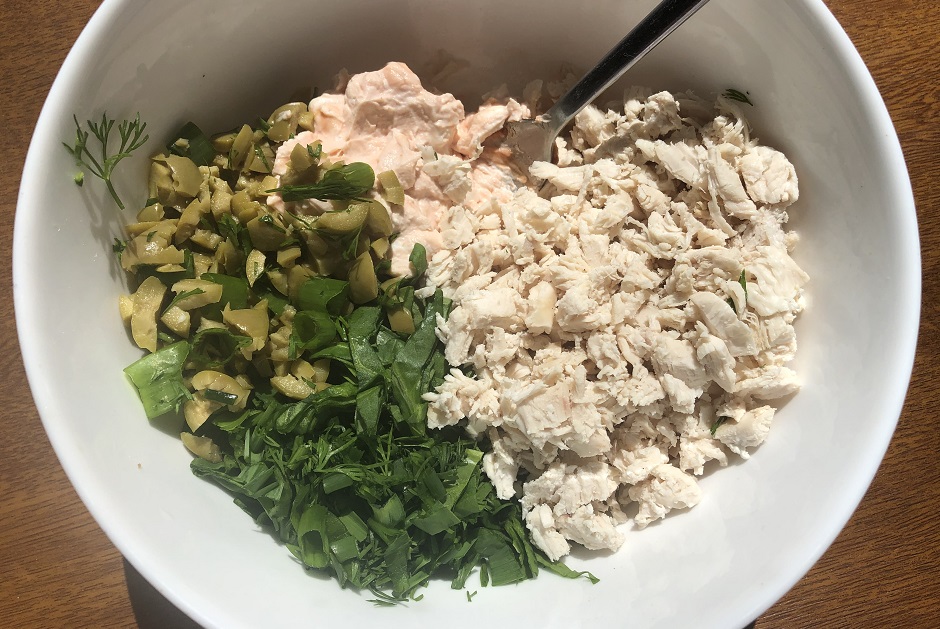 Отварим куриную грудку, остудим и мелко нарежем. Также измельчим зелень и оливки, сыр натрем на крупной терке. Творожный сыр смешаем с томатным соусом, а затем – с начинкой. Не берите сливочный плавленый – он не такой плотный, вытечет при нагревании.
