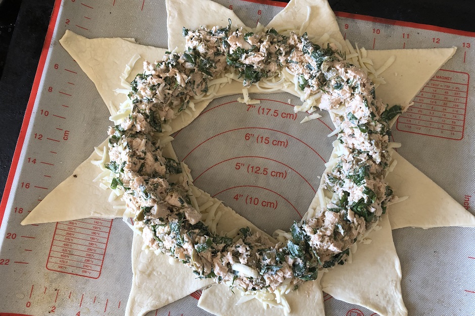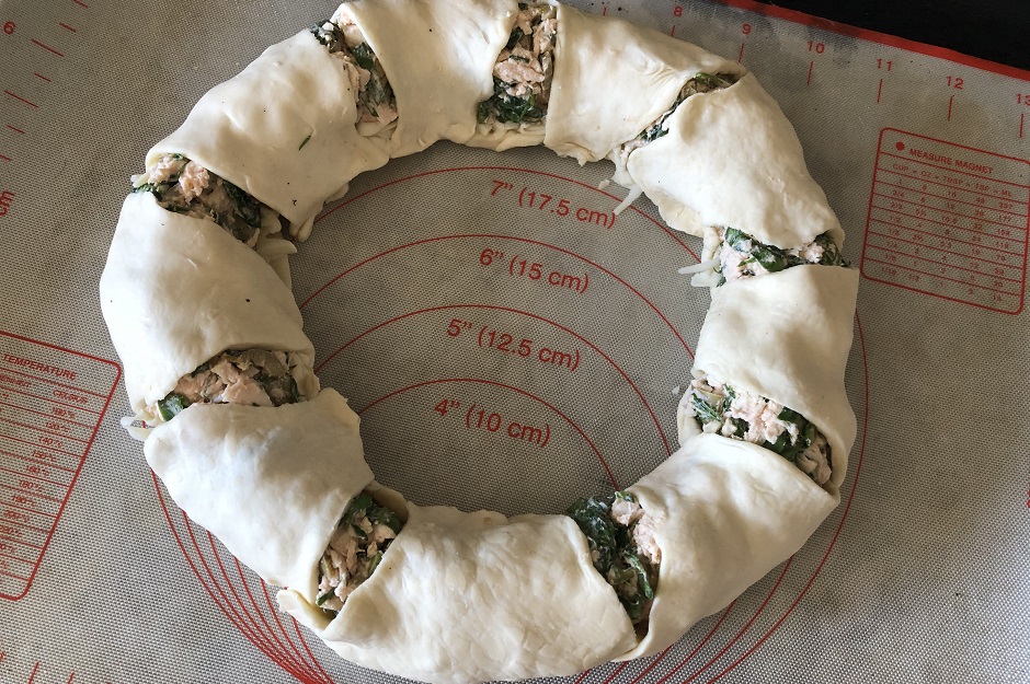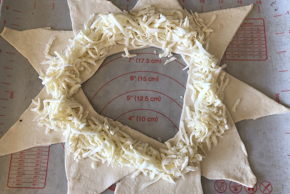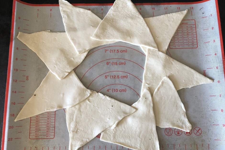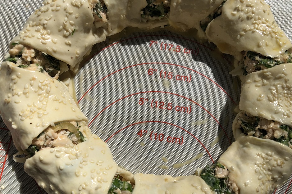 Размороженное тесто раскатаем и разрежем на треугольники. На силиконовый коврик или пергамент выложим тесто внахлест. Первый слой – тертый сыр, сверху – начинка. Можно ложкой, но удобнее – руками. Заворачиваем треугольники внутрь, закрепляем надежно снизу, чтобы не раскрылись при запекании. Сверху смажем взбитым яйцом. Есть кунжут – отлично. Нет – и так сойдет.