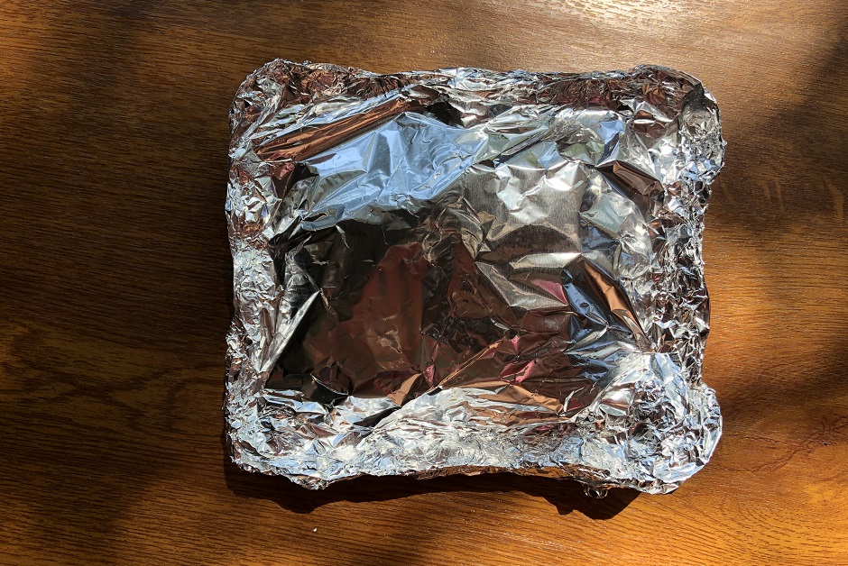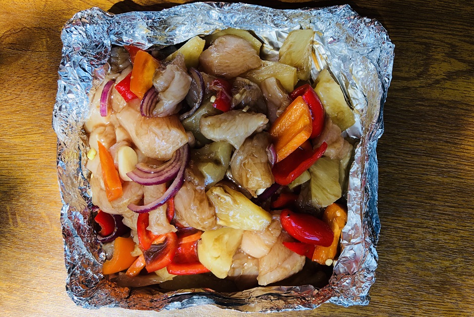Сделаем «коробку» из фольги. Кладем два листа, в центр – половину начинки. Завернем к центру края – получатся «стены». Соединим их в стыках. Сверху – еще лист, сложенный вдвое, это «крышка». Скрепим тщательно с боковинами, чтобы сок не вытекал. Для указанного количества продуктов нужно две «коробки».