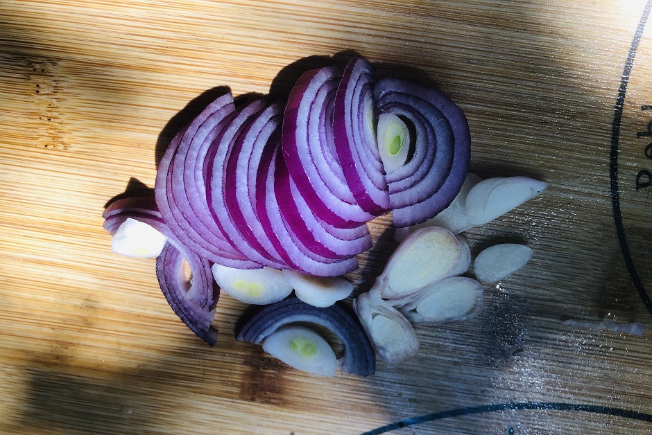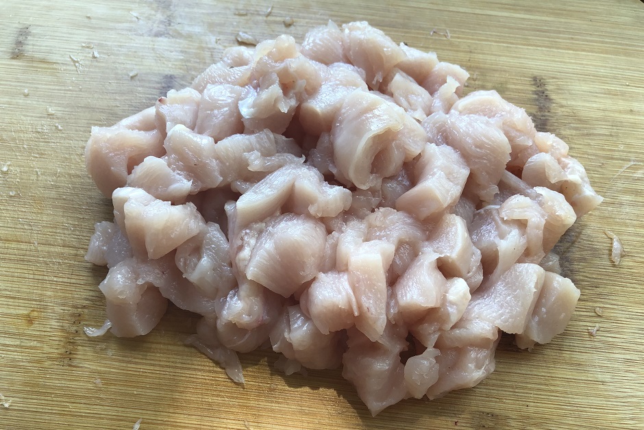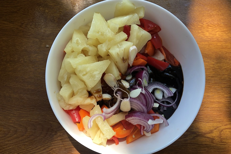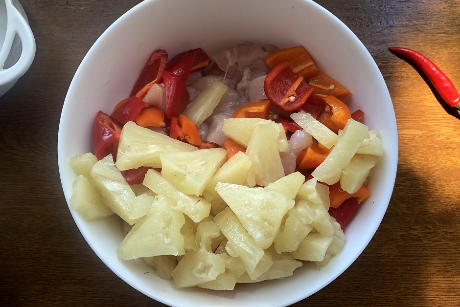Мясо порежем некрупными одинаковыми кубиками. Небольшими кусочками – перец и ананас. Лук полукольцами, чеснок – тонкими пластинами. В терияки добавим имбирь, перемешаем. Если заправка покажется очень густой, добавьте ложку соевого соуса или винного уксуса. Все ингредиенты сложить в миску, перемешать и залить терияки, оставить на 20-30 минут.