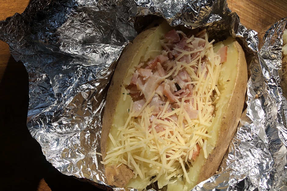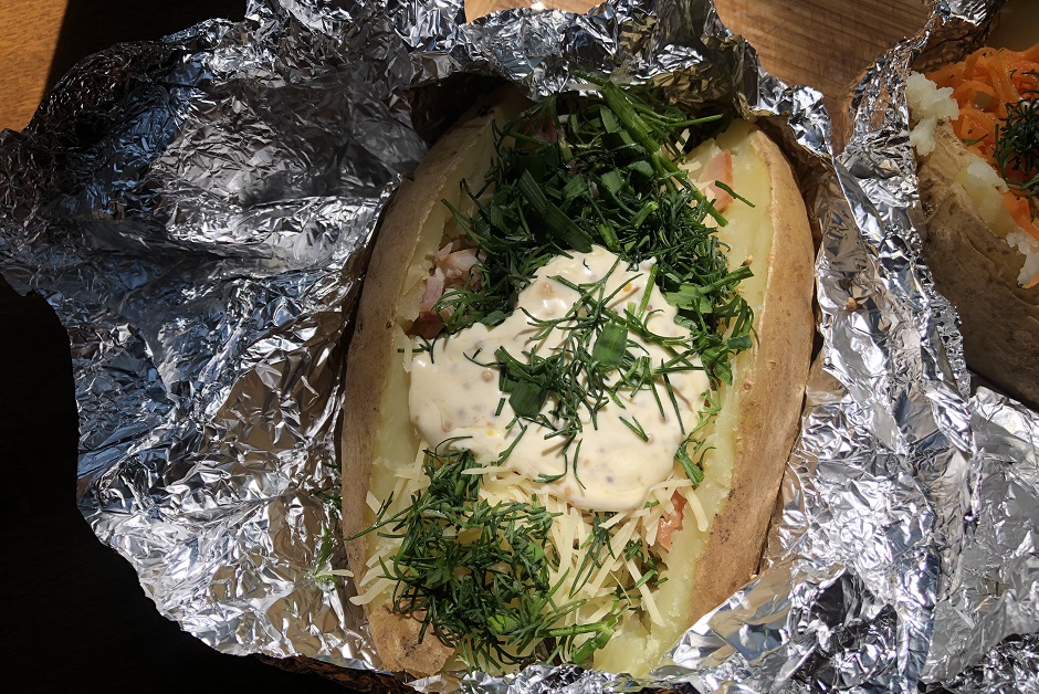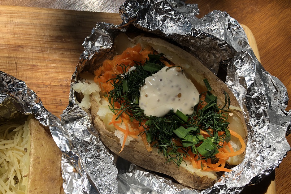 Затем соедините половины и запечатайте снова в фольгу. Пара минут и можно есть. Делайте начинку с запасом. Она съедается быстрее картошки – будет, что добавить внутрь. Или разнообразить. А то получится, как у дегустационного мальчика – эстетика закончилась, в ход пошли майонез с кетчупом. Даже кожуры не осталось.