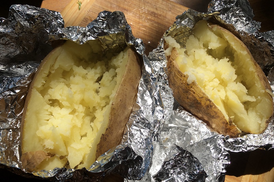 Картофель тщательно потрем металлической щеткой и завернем в фольгу в два слоя, чтобы не подгорел. Положим в разогретую до 180 градусов духовку или в угли. На 15-сантиметровые клубни мне потребовалось около полутора часов в духовке. Проверяем готовность ножом. Когда клубни станут мягкими, достанем, развернем фольгу, но не убираем ее. Пусть чуть остынет – 10 минут.
