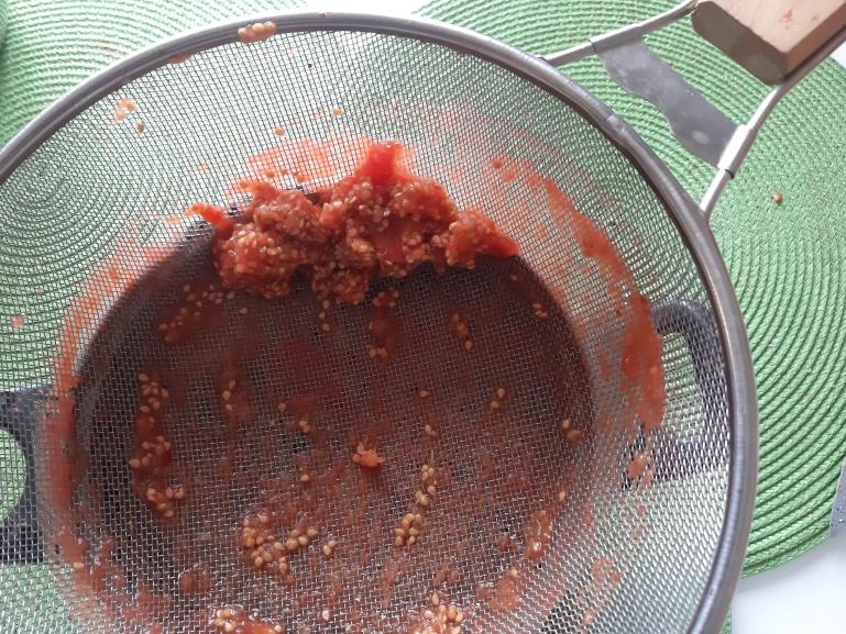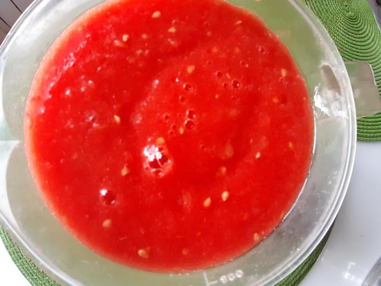 С указанного количества помидоров у вас получится 3 литра сока, который уварится до полутора литров кетчупа. Помидоры заливаем кипятком, выдерживаем 5—10 минут, снимаем шкуру. Пюрируем в блендере, затем протираем через сито, чтобы удалить семена. Тогда получится та самая консистенция.