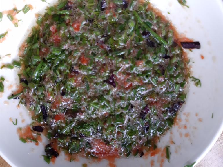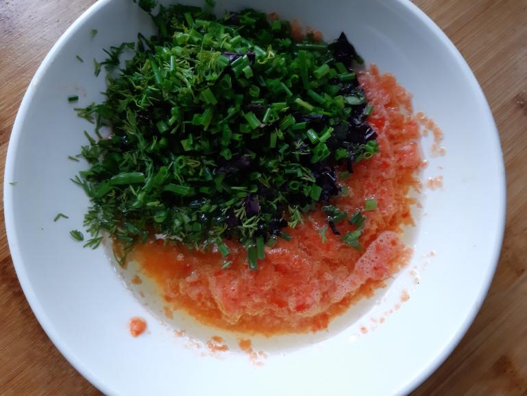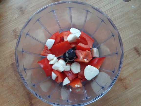 В блендере измельчим болгарский перец, чили, чеснок. Добавим масло, уксус, соль, сахар и измельченную зелень, перемешаем. Можно взять обычный 9% уксус. У меня виноградный белый 6%. Помидоры разрежем пополам или на четыре части.