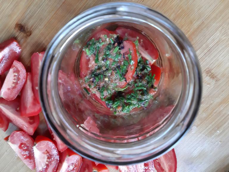 В банку уложим слоями: помидоры, столовая ложка соуса и повтор. Закрыть крышкой, отправить в холодильник. Если у вас большая банка, можно перевернуть вверх дном – тогда те, что сверху, быстрее промаринуются.