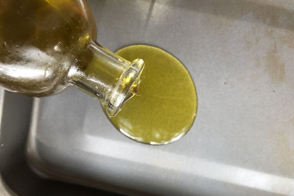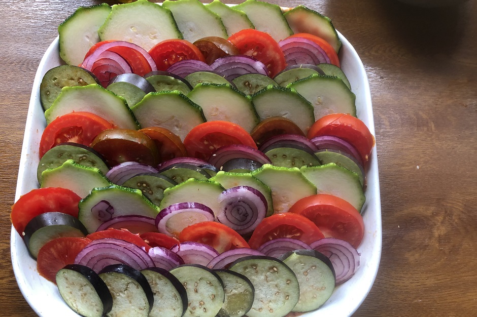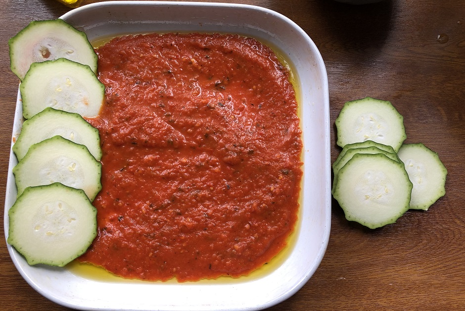 В форму нальем оливковое масло, следом – томатный соус (из супа, помните?). Теперь выкладываем овощи, чередуя, внахлест. Можно слева направо, можно по спирали. Сверху – пара капель оливкового масла, чеснок и порезанный кубиками перец.