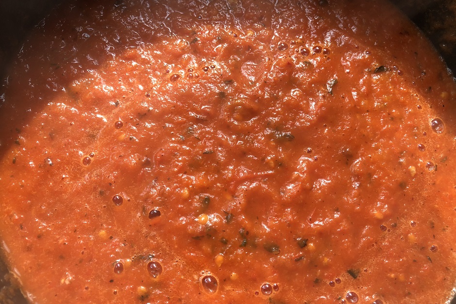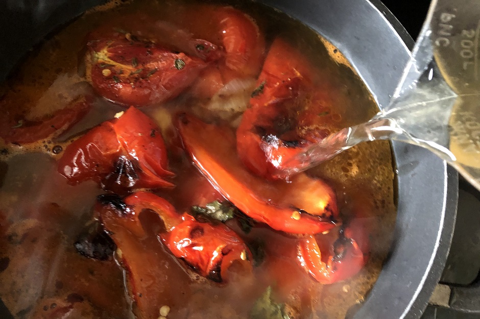 Переложим запеченные овощи в кастрюлю. В другой подогреем куриный бульон. Его можно заменить и овощным. Затем добавим к овощам, доведем до кипения. Следом – табаско и соус барбекю. Они по вкусу близки, поэтому если вдруг чего-то не окажется – можно обойтись только барбекю или табаско. Готовим еще 5 минут.