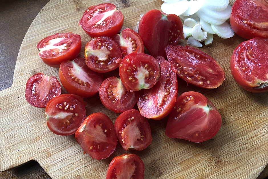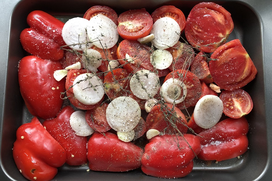 В форму нальем 4 столовые ложки масла и накалим его 10 минут в заранее разогретой до 220 градусов духовке. Порежем помидоры пополам, перцы – на 4 части, лук – кольцами, чеснок – пластинами. Перец чили – если любите. Все сложить в форму, перемешать, добавить соль, сахар, тимьян, черный молотый перец.