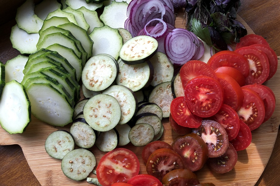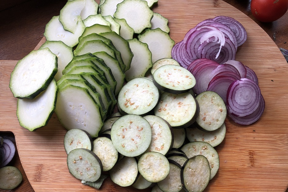 Просто, быстро, постно. Вкусно в холодном и горячем виде. Лук берите фиолетовый, он вкуснее и слаще. Кабачки, лук, баклажаны нарежем поперек тонко – до 5 миллиметров. Помидоры чуть толще – они готовятся быстрее остальных. Лук – кольцами, чеснок – мелко.