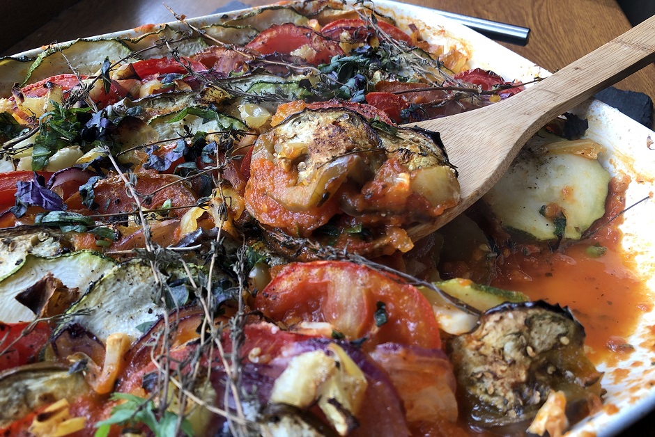 Вместо него можно добавить свежий зеленый горошек или вообще ограничиться основным составом из помидоров-кабачков-баклажанов. Затем – тимьян, перец, соль и в духовку на 25-30 минут. Готовый рататуй посыпать базиликом. Пусть чуть остынет, готово. Красавчик!