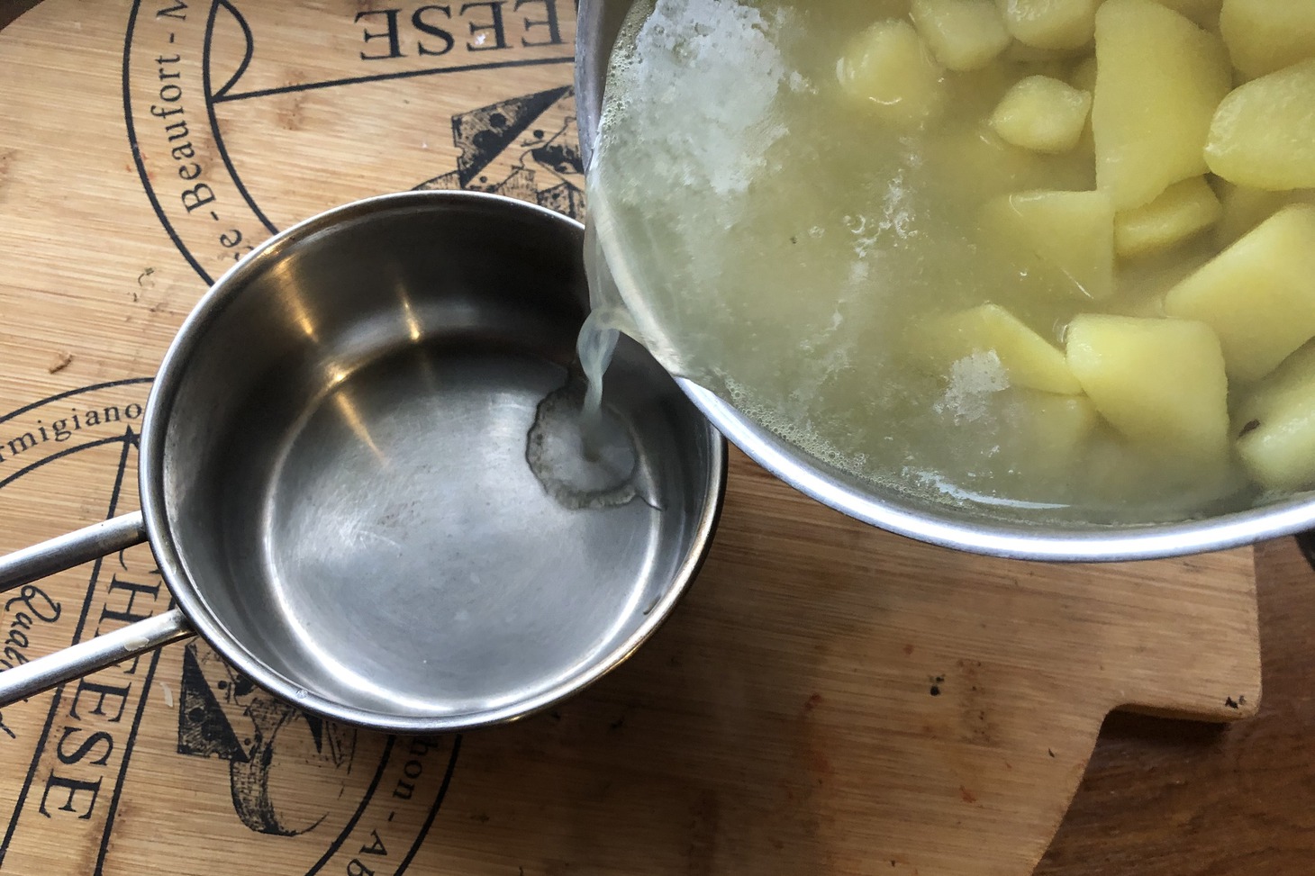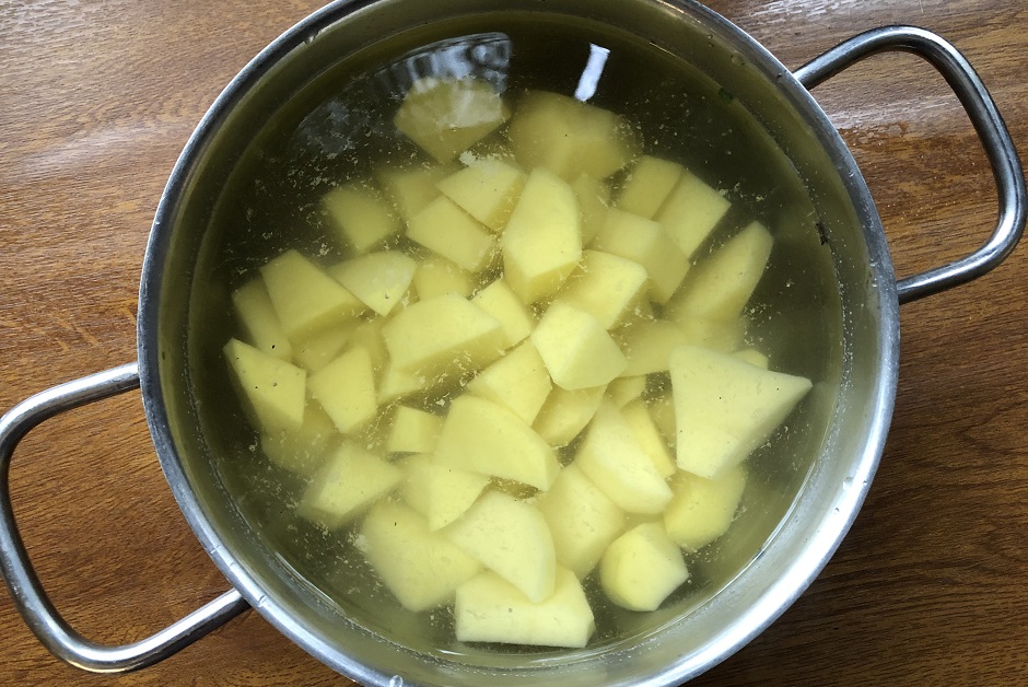 Очистим картофель, порежем на 4-6 частей, отварим до полной готовности в подсоленной воде. Порежем мелко лук и кубиками – грибы. Обжарим 5 минут на растительном масле. С готового картофеля сольем в отдельную емкость отвар.