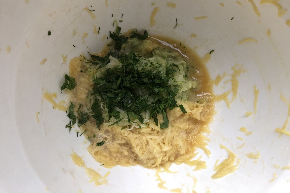 Картофель и лук очистим, натрем на мелкой терке. Добавим яйцо и соль. Если хотите с начинками – делите полученную смесь на части: для драников с кабачками добавьте натертый на мелкой терке вместе с кожурой кабачок и порезанную зелень; для сырных — измельченный чеснок и тертый сыр твердых сортов, перец. Третий вариант – с грибами. Здесь идут порезанные и обжаренные шампиньоны.