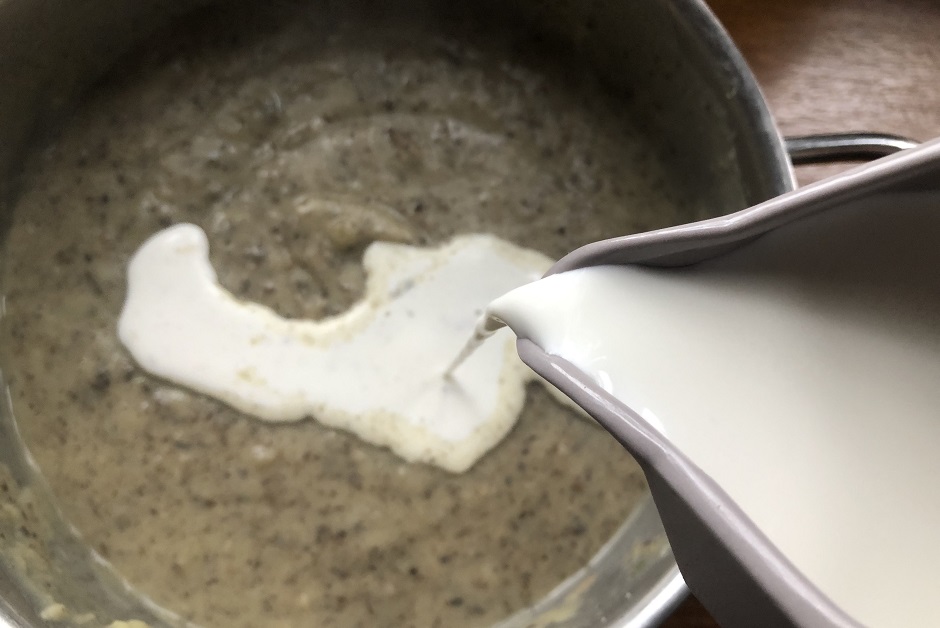 Добавим в полученную смесь картофельный отвар и теплые сливки. Сколько лить – решайте сами. От количества будет зависеть густота супа. Можно добавить все сливки и затем регулировать отваром.