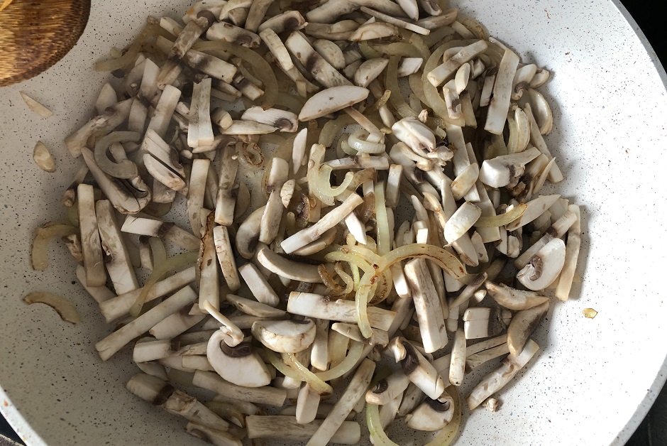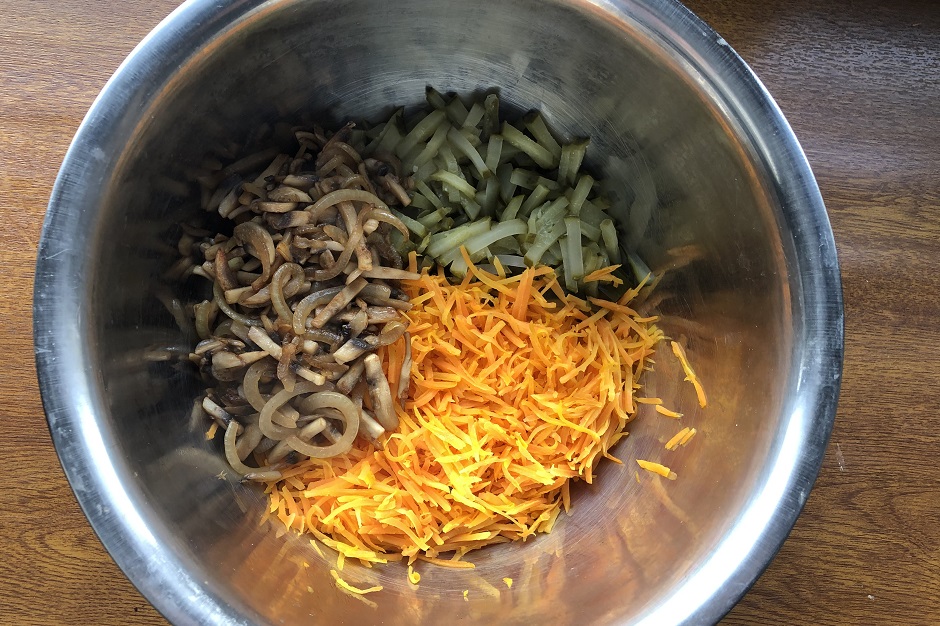 На растительном масле вначале обжарим морковь не больше 5 минут. Переложим в миску. Затем – шампиньоны и лук 7-10 минут. Соединим все ингредиенты, добавим давленный чеснок. Перед подачей на стол перемешаем с майонезом, посолим. Готово.