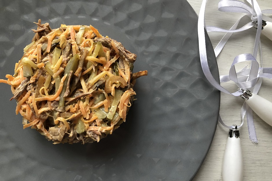 Отварим говядину, остудим до комнатной температуры, порежем тонкими полосками. Морковь – на терке для корейской моркови, лук – полукольцами. Шампиньоны и огурцы – полосками в сантиметр-полтора.