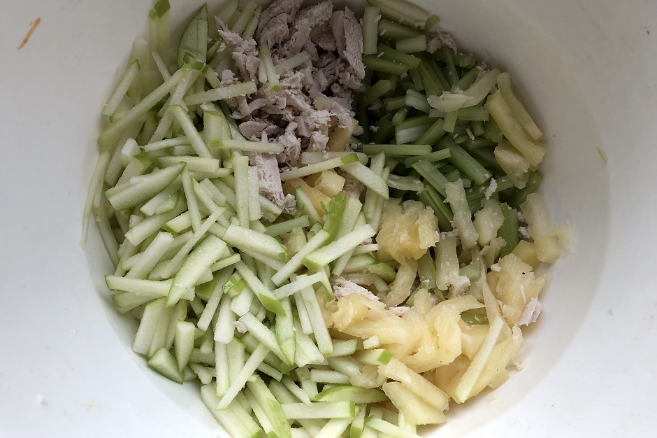 Нарежем яблоко тонкими дольками, затем полосками. Сбрызнем лимонным соком, чтобы не почернели. Ананас берите тот, что дольками. Каждую разрежем на два-три кусочка по вдоль. Стебли сельдерея – длинными продольными полосками, затем кусочками в сантиметр-полтора. Курицу – как хотите. Объединим весь состав.