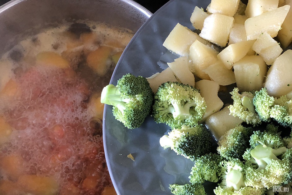 Овощи чистим и режем кубиками в полтора-два сантиметра. Брокколи разделим на соцветия, можно взять и замороженную. А можно заменить на цветную капусту – получится более оранжевый, а не зеленый суп. В кастрюлю укладываем морковь и тыкву – им вариться дольше. Ставим на огонь, как закипит – убавим до среднего, варим 10 минут. Затем добавляем кабачок и капусту, еще 5-7 минут. Воды должно быть столько, чтобы овощи были закрыты, не больше.