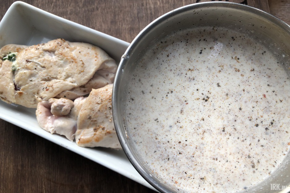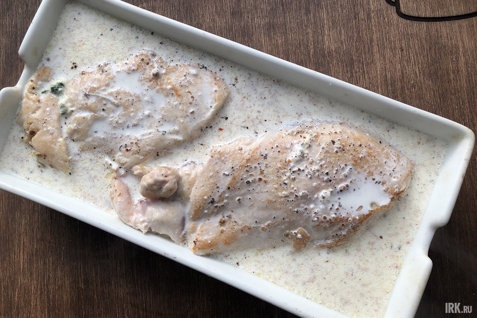 Переложим грудку в форму для запекания, зальем соусом, накроем фольгой и поставим в духовку на 20 минут. Сочная курица без хлопот готова. Порежем поперек и съедим с наслаждением, обмакивая кусочки в молочный соус. На второй день ничуть не хуже.