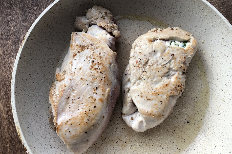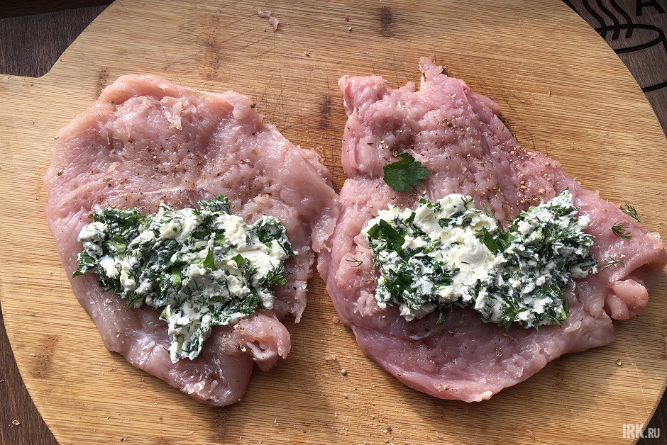 На одну половину филе уложим начинку, закроем второй половиной. На небольшом количестве оливкового масла обжарим с двух сторон по паре минут. Или сделать это на гриле и без масла.