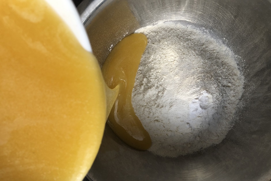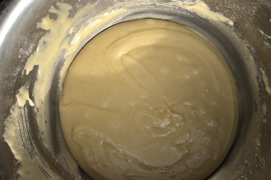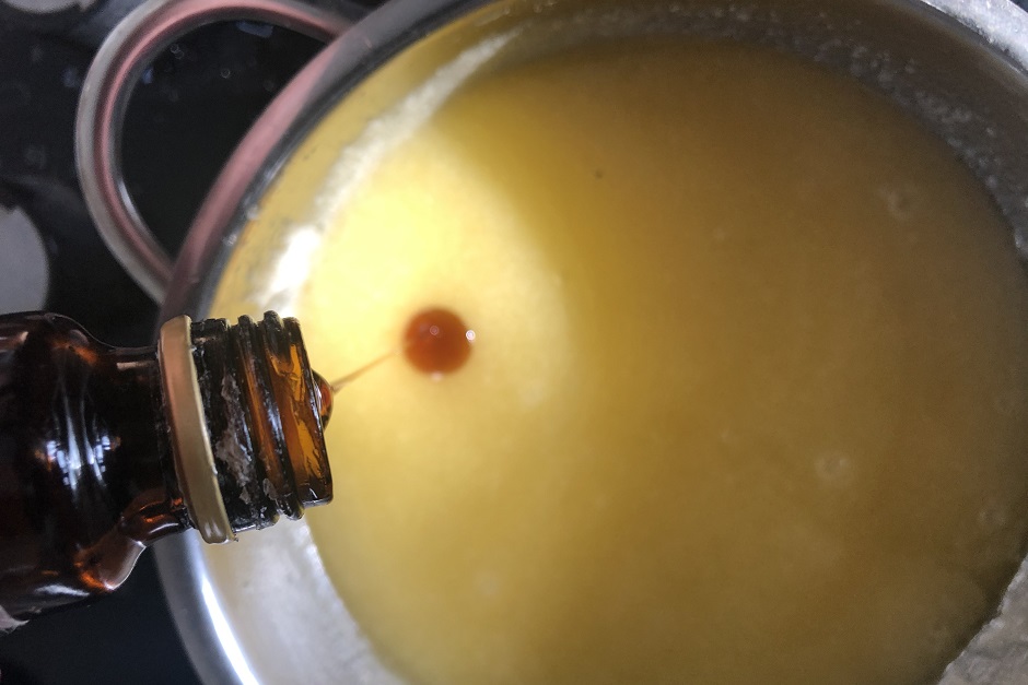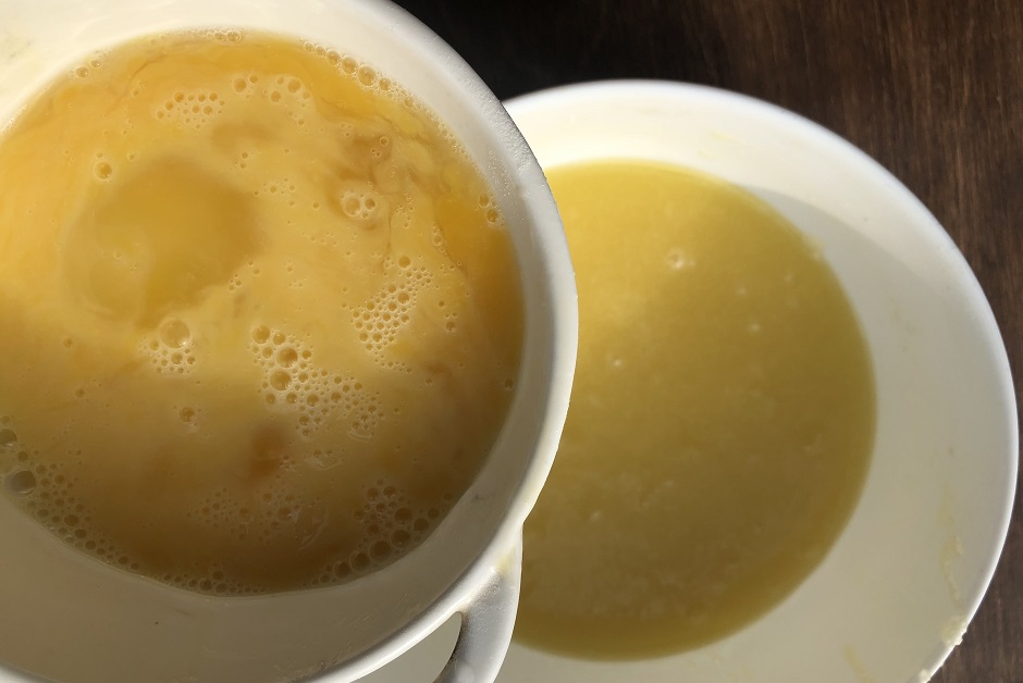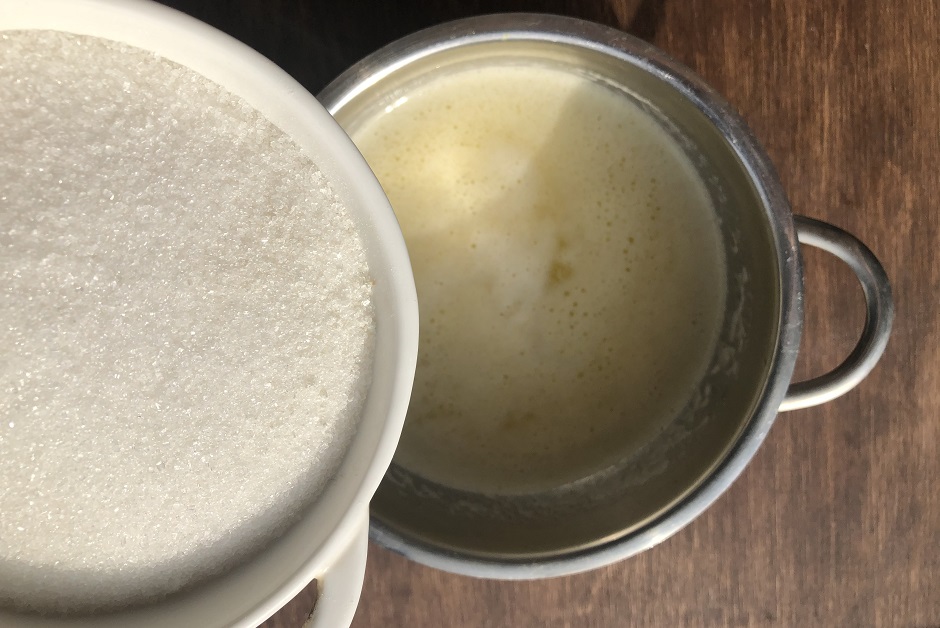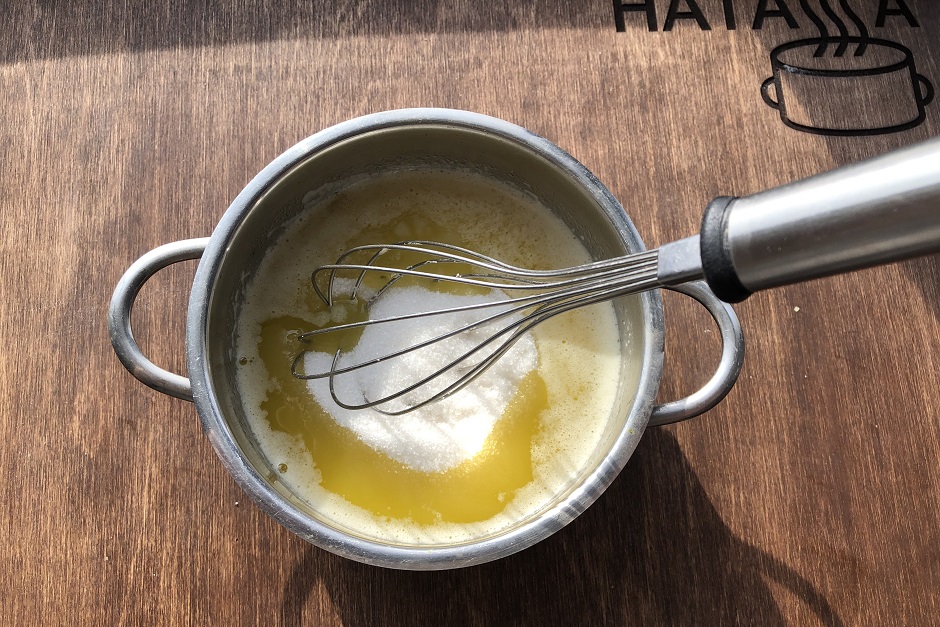Растопим в сотейнике сливочное масло. Затем вмешаем венчиком сахар и щепотку соли. Следом – пару капель ванильной эссенции, перемешаем и снимем с огня. Добавим в масляную смесь яйца (предварительно чуть взбитые). Перемешаем венчиком.