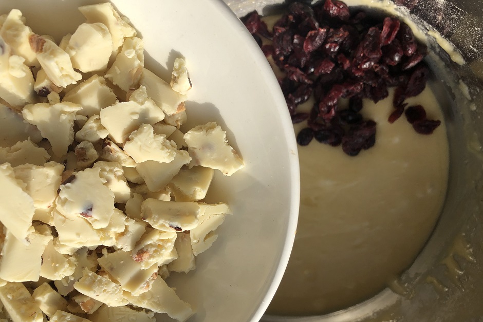 Поломаем шоколад на небольшие кусочки. Добавим вместе с клюквой в тесто. Перемешаем.