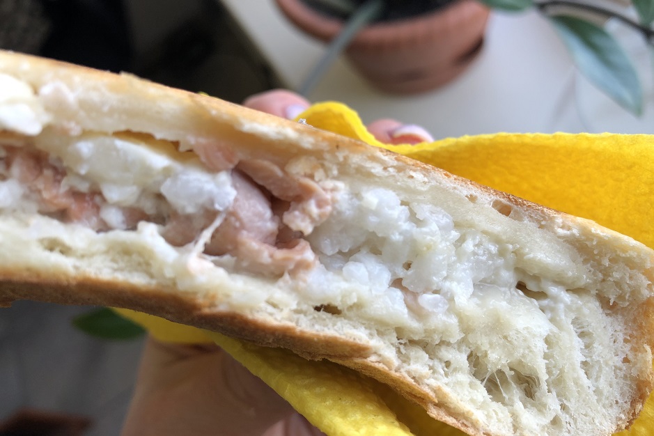 А это – наша новая любовь. Чудо-еда с закрытым верхом из дрожжевого теста и горой сочной начинки – внутри красная рыба, рис, обжаренный лук. Но главная фишка – сливочный сыр креметто. Его ели молча. Заслуженная пятерка пирогу. С таким гостей встретишь – хозяйкой года будешь. Сладкие пироги от GRILLMAN попробуем в следующий раз.