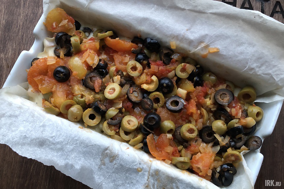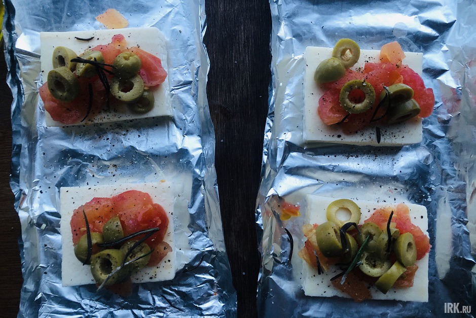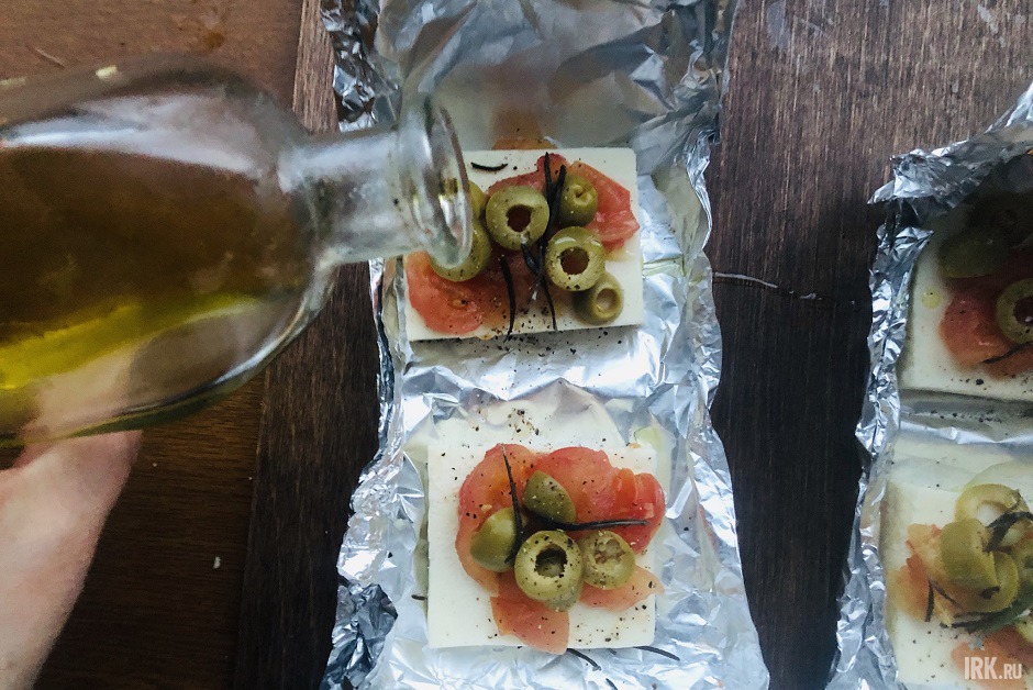 Писать этот рецепт дольше, чем готовить. Нарежем адыгейский сыр пластинами в сантиметр толщиной. Сверху – кольца оливок, порезанные помидоры. Как и в крамбле, они могут быть любыми на ваше усмотрение. Чеснок, розмарин, специи и капля масла. Делаем конверты из фольги. Кладем в форму, ставим в духовку при 180 градусах на 15 минут. Закуска готова.