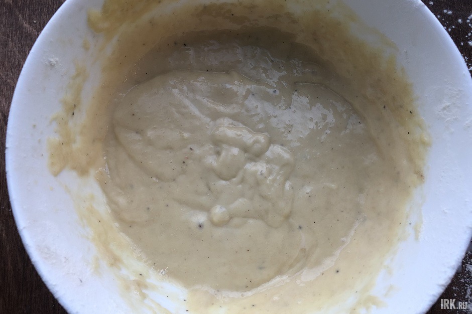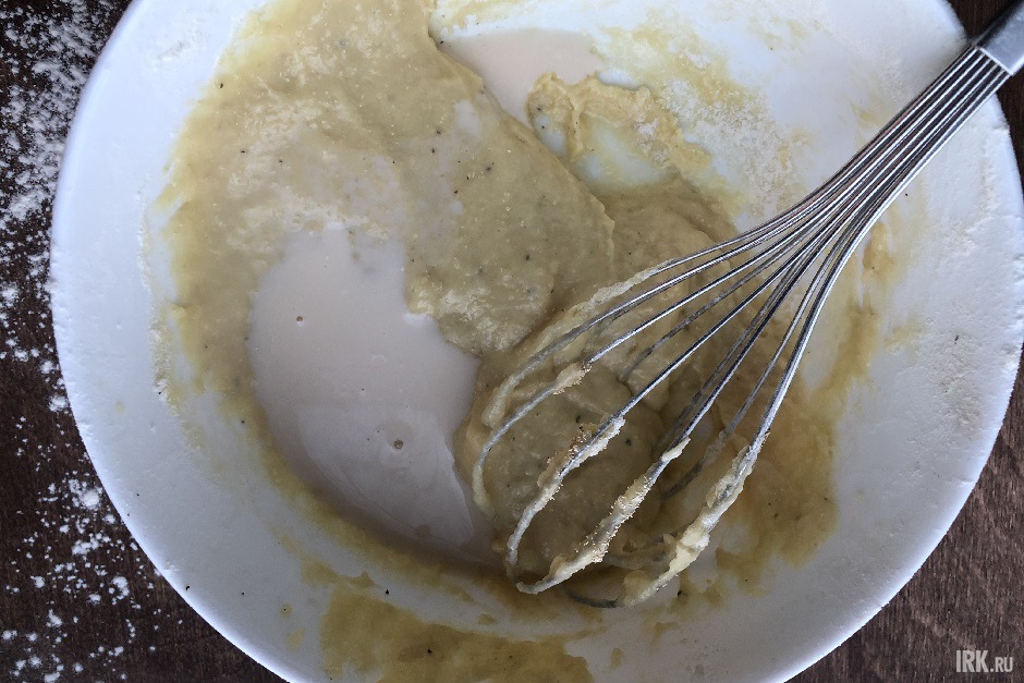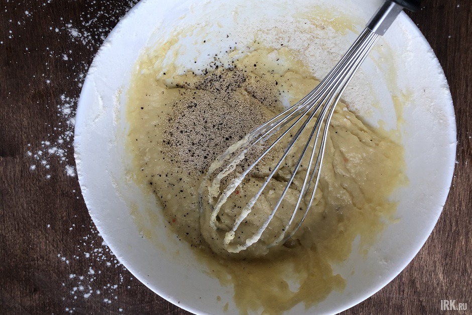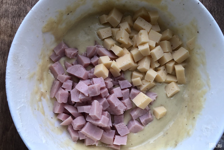 Для теста 80 миллилитров оливкового масла вбиваем с яйцами. Смешаем муку, дрожжи, щепотку соли и перец (по желанию), добавим к жидкой смеси. Туда же – молоко и перемешаем. Затем – нарезанные небольшими кубиками сыр и ветчину.