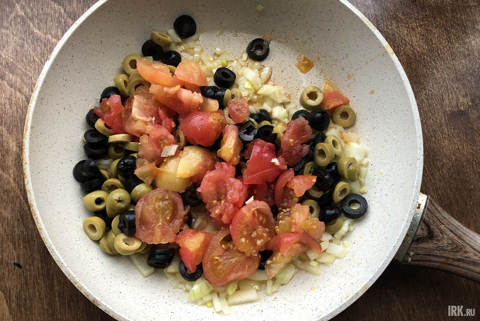 Для начинки помидоры очистим от шкурки и порежем. Хотите – берите свежие, консервированные или домашние заготовки. У меня соленые мамины. Оливки и маслины нарежем кольцами, лук – мелко, чеснок тоже измельчим. На двух столовых ложках оливкового масла обжарим лук, добавим чеснок, помидоры, оливки-маслины. Сахар, соль, перец. Чуть потушим на среднем огне, 5-7 минут.
