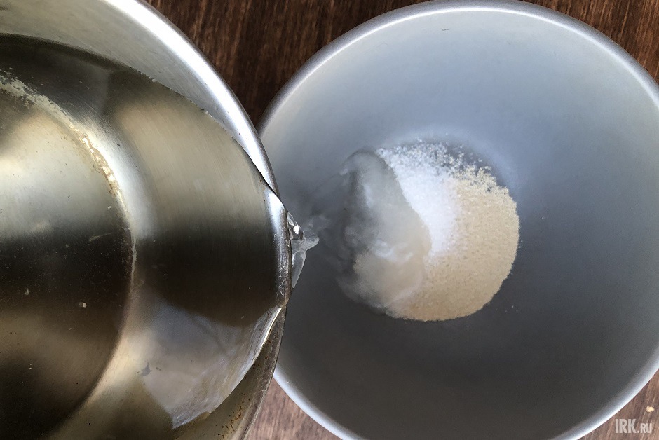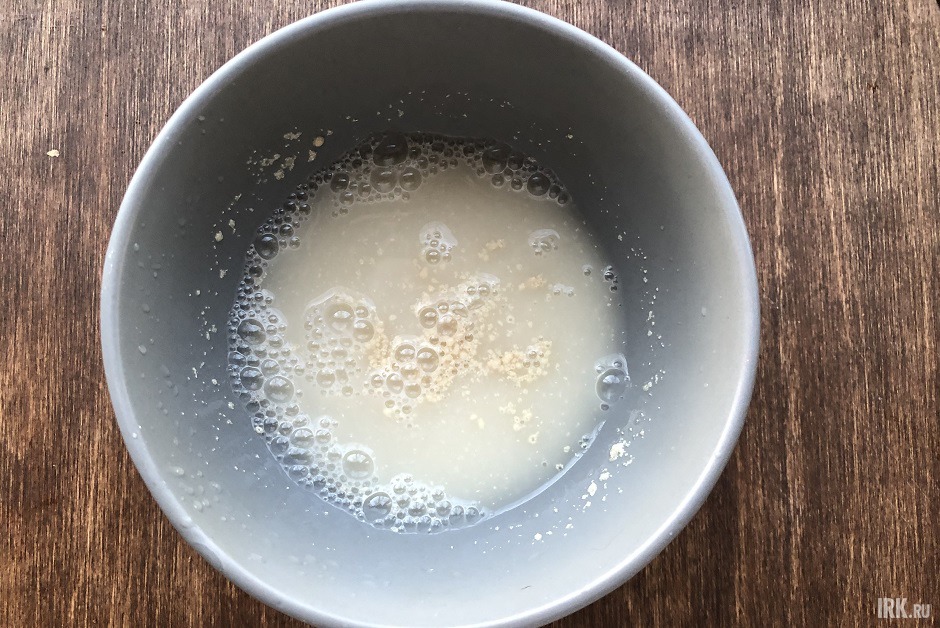 Тесто. Смешаем дрожжи с сахаром, добавим теплую воду, перемешаем. Оставим в тепле на 10 минут. Затем добавим теплое молоко, соду, муку, замесим тесто. Оно должно получиться чуть гуще, чем на традиционные блины. Но не настолько густое, как для оладий. Оставляем на полчаса.
