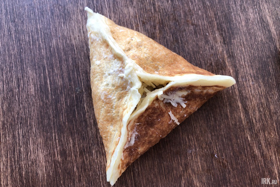 Защипываем треугольником – вот для чего было важно не пересушить тесто. Если вдруг передержали блины на сковороде – чуть смочите пальцы водой. А вообще не стремитесь к идеальной форме и 100 %-му ровному шву – это же не пельмени или вареники.