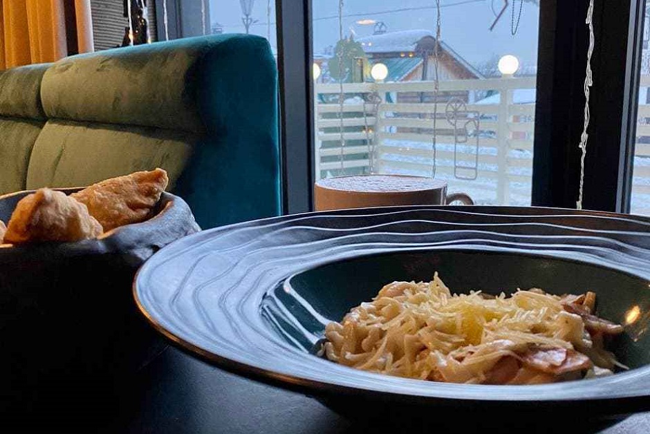 Пообедайте в приятной обстановке, в сопровождении любимого фильма (его можно «заказать» через официанта или администратора). А к вечеру возьмите полуфабрикаты с собой домой или закажите доставку по номеру 72-95-95.
