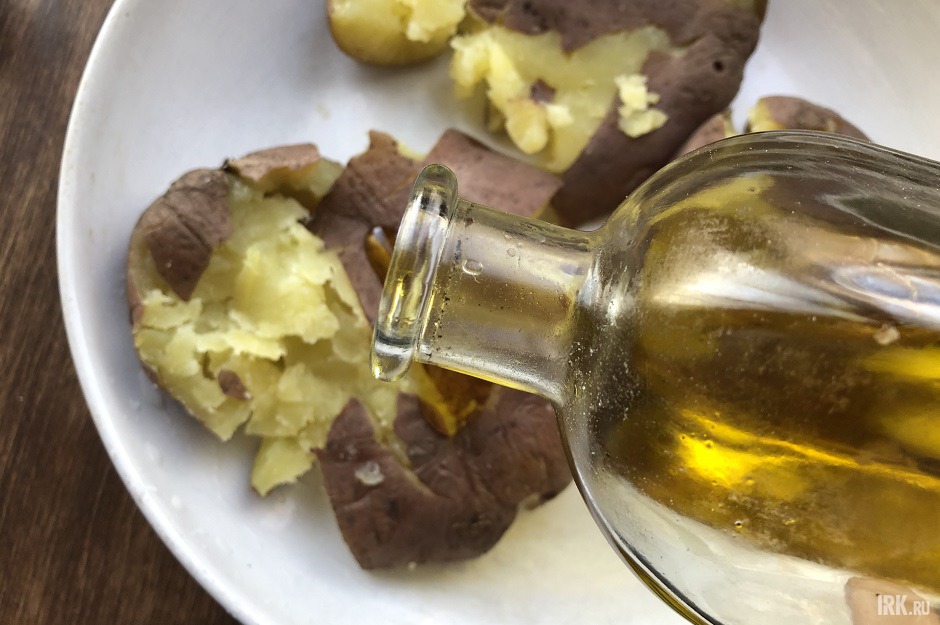 Потрем металлической щеткой некрупный картофель, отварим до готовности. Пусть остынет 5 минут. Затем раздавим клубни стаканом, положим в форму для запекания. Сверху – по чайной ложке оливкового масла, соль и перец по вкусу. Ставим в разогретую духовку на 180 градусов на 10-15 минут. Какая красота.