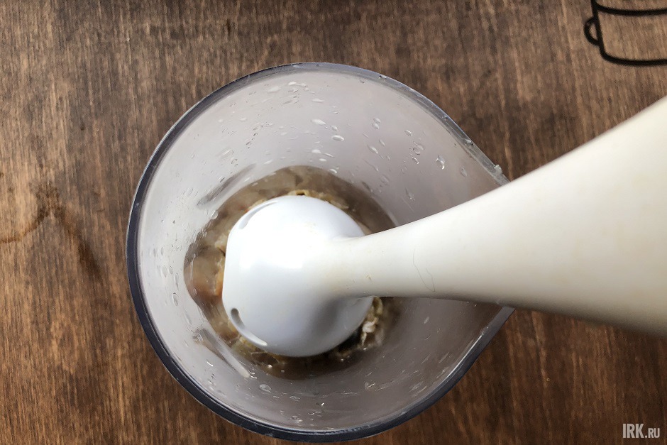 Соленую сельдь нарежем на некрупные куски и пюрируем блендером. Не переживайте за мелкие кости – блендер их добьет.