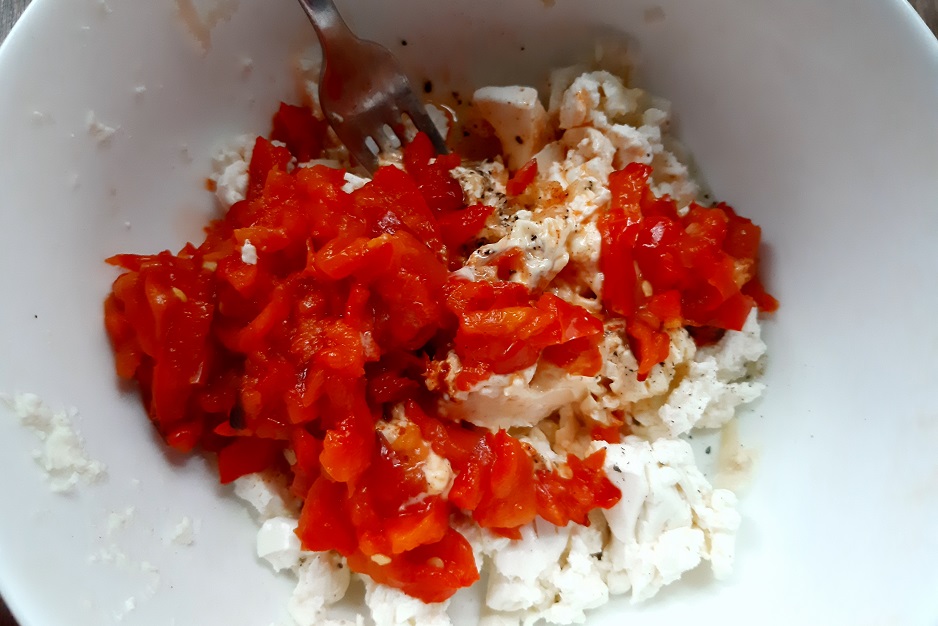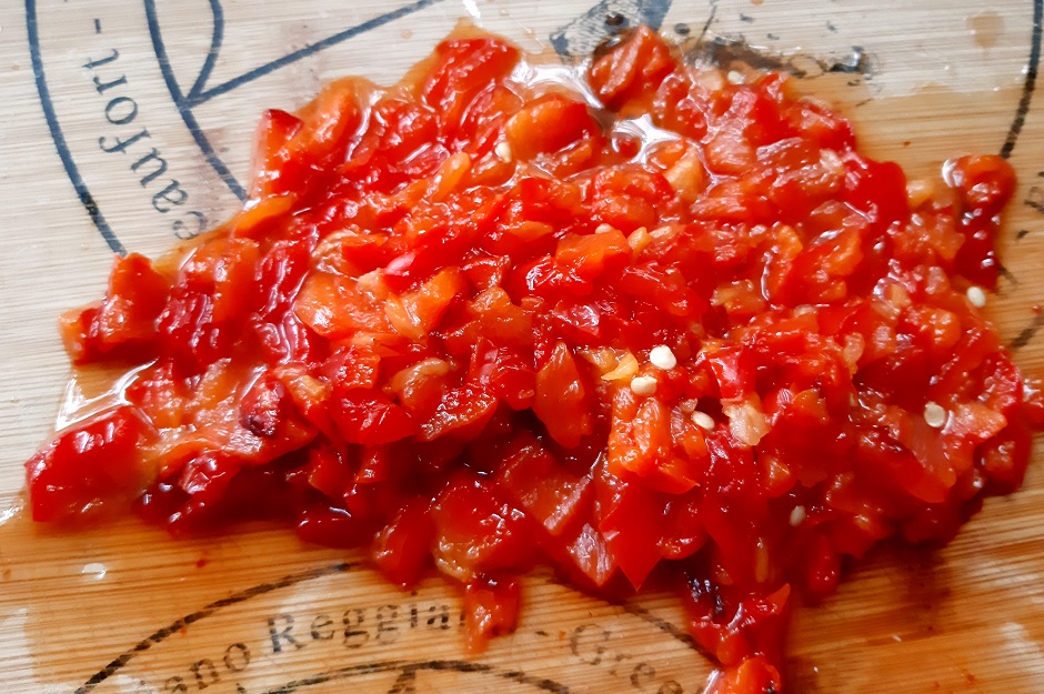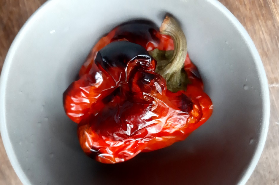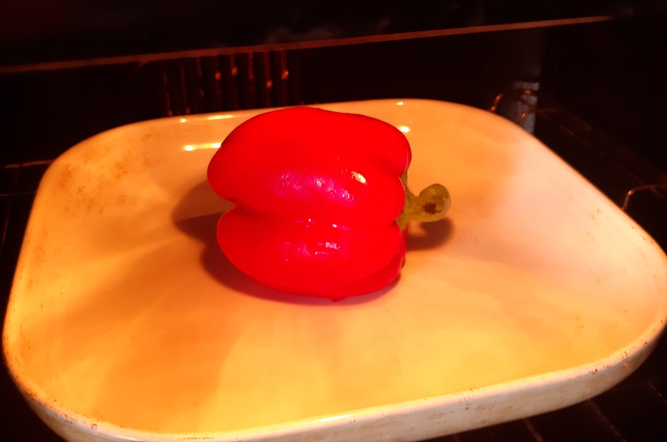 Разогреем духовку до 200 градусов. Положим перец в форму и запечем 15-20 минут до мягкости. По готовности достанем, положим в миску, накроем пленкой, дождемся, когда остынет. Очистим от кожицы и семян, измельчим.