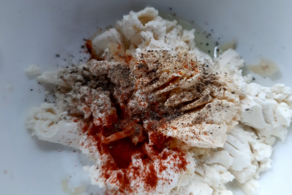 Чеснок пропустим через пресс, разомнем фету вилкой, объединим с чесноком. Добавим перец, специи, масло, сметану и соль. Перемешаем, готово.