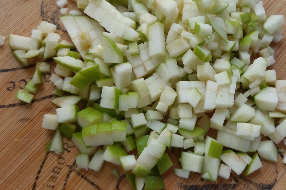 Подготовим ингредиенты для салата. Консервированный тунец разомнем вилкой, сольем жидкость. Сельдерей и яблоко нарежем мелко. Морковь – на терке, лук – колечками. Соединим все вместе, сбрызнем лимонным соком.