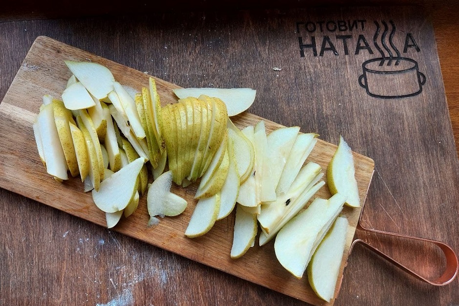 Миксером соединим продукты для заливки. Удалим у груш сердцевину, нарежем тонкими дольками.